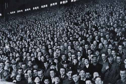 Spion Kop ราวปี 1950 ช่วงนั้นอัฒจันทร์ในอังกฤษจะเป็นตั๋วยืนเกือบทุกที่นั่ง ทำให้สนามจุคนได้เยอะ เมื่อเทียบกับปัจจุบัน เพราะยืนเบียดๆๆกัน แบบสนามกีฬาชนบทบ้านเรา