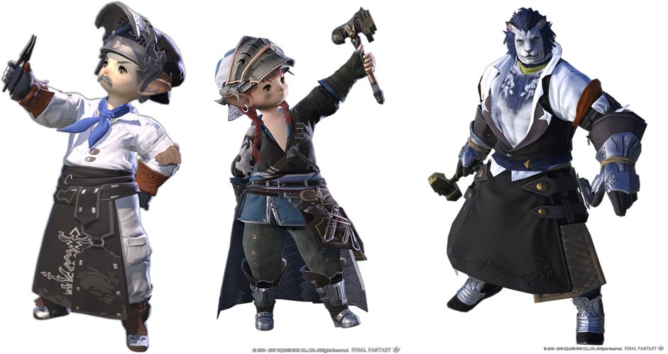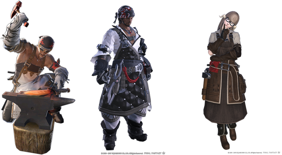 วัตถุดิบหลักที่ใช้ในการสร้างสิ่งของของ Blacksmith คือโลหะต่างๆ จาก Miner Blacksmith จะแปรรูปโลหะเหล่านี้เพื่อใช้ในการสร้างอาวุธและเครื่องมือที่ทำจากโลหะสำหรับหลายอาชีพ เช่น สนับและกงเล็บของ Pugilist ดาบของ Gladiator ขวานของ Marauder ดาบใหญ่ของ Dark Knight ปืนของ Machinist เคียวของ Botanist อีเต้อและค้อนของ Miner มีดของ Culinarian และ Leatherworkers ค้อนของ Goldsmith, Carpenter, Blacksmith และ Armorer เลื่อยของ Carpenter คีมของ Armorer ครกบดยาของ Alchemists เหล็กเจาะรู ของ Leatherworkers และตะไบ Blacksmith เป็นต้น