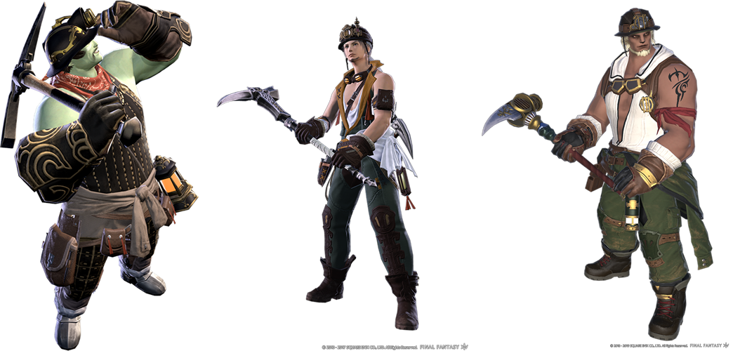 Miner เป็นผู้รับผิดชอบธุรกิจทางสินแร่ของ Eorzea Miner จึงจำเป็นต้องศึกษาเกี่ยวกับภูมิศาสตร์ของพื้นที่ต่างๆ เพื่อค้นหาวัตถุดิบที่มีในเฉพาะพื้นที่นั้นๆ ไม่ว่าจะเป็นสินแร่สำหรับ Blacksmith Armorer Goldsmith หินมีค่าเพื่อเจียระไนเป็นอัญมณีสำหรับ Goldsmith เกลือสำหรับฟอกหนังของ Leatherworker เกลือสำหรับทำอาหารของ Culinarian รวมไปถึงทรัพยากรอื่นๆ ที่ได้จากการขุดเจาะพื้นที่เหล่านั้น เช่น ฟอสซิลหรือน้ำพิเศษต่างๆ สำหรับการปรุงยาของ Alchemist เป็นต้น เหล่า Miner เชื่อว่าพวกเขาอยู่ในการคุ้มครองของ Oschon เทพแห่งการเดินทาง ทำให้การเดินทางของพวกเขาปราศจากภัยอันตรายต่างๆ