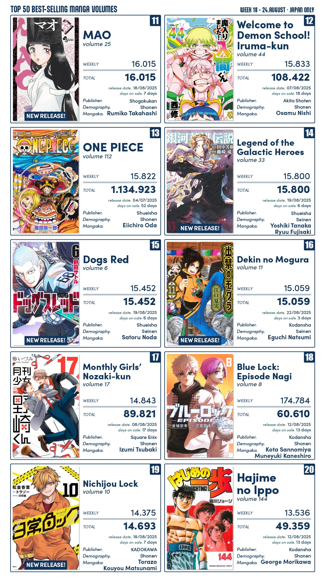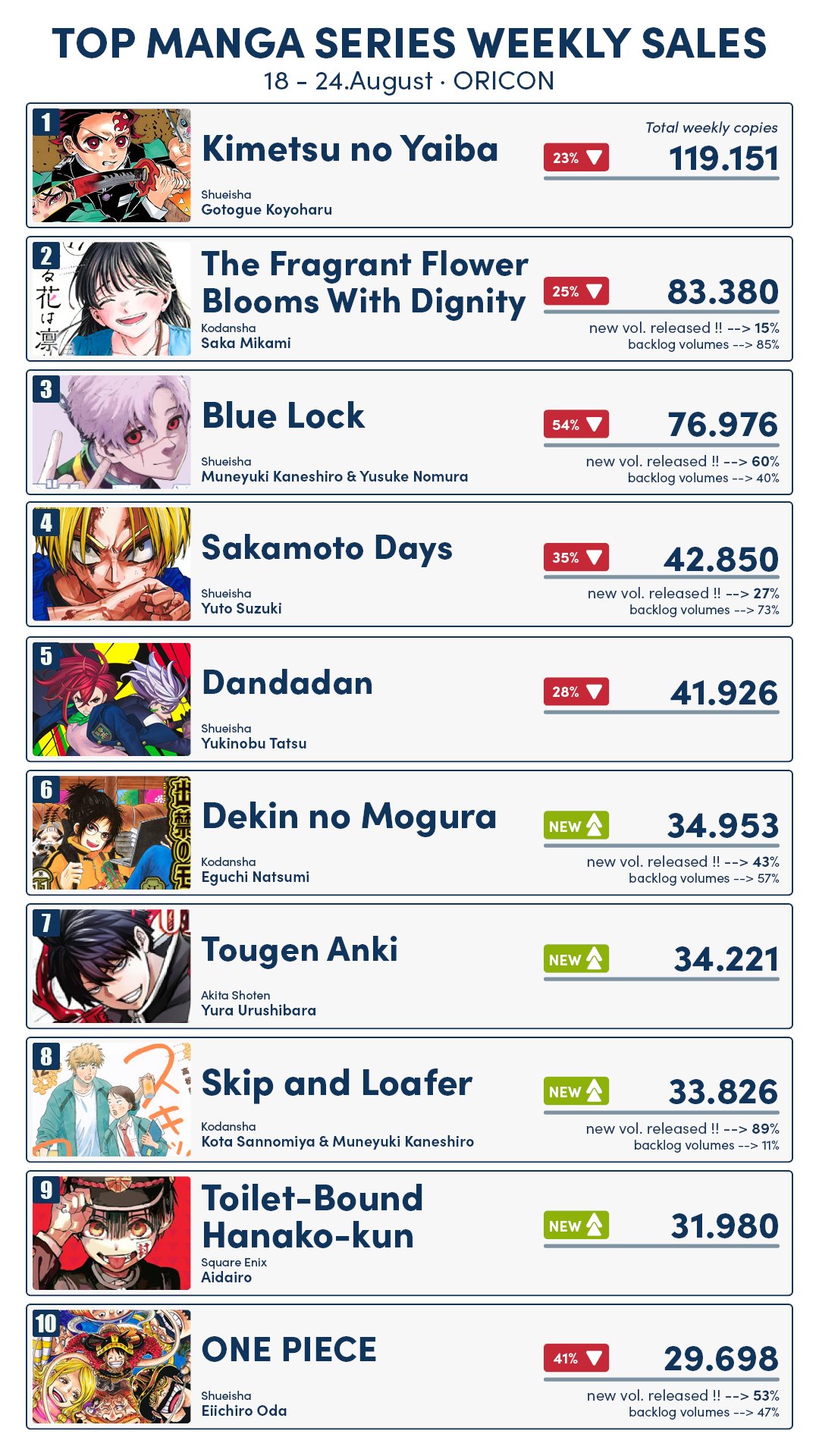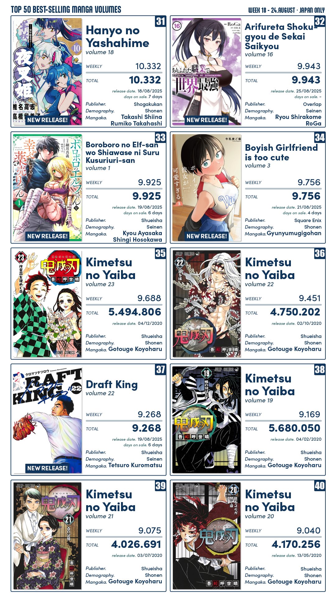 ยอดขาย manga 18 - 24 ส.ค.68 ดาบพิฆาตอสูรกวาดอันดับ 1