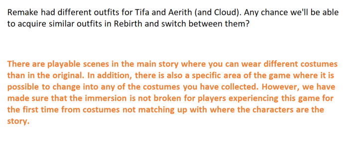 มีเปลี่ยนชุดตามเนื้อเรื่อง และมีสถานที่ในเกมที่จะเปลี่ยนชุดอะไรก็ได้ที่เคยสะสมมา แต่จะไม่ให้ใส่ชุดที่ขัดกับฟีลของเนื้อเรื่องในการเล่นครั้งแรก
